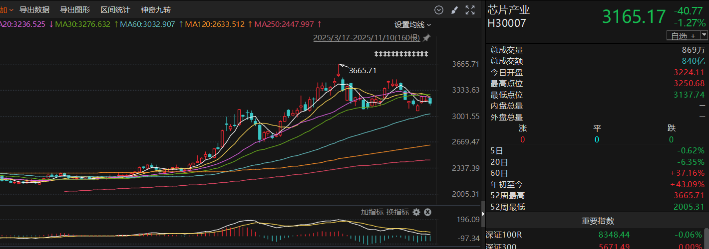 芯片板块今天继续回调,距离60日均线已经比较近,我也是在等60日均线的回踩,目前60日均线、120、250三条均线还是处于发散状态,中期、长期趋势我不是很担心。