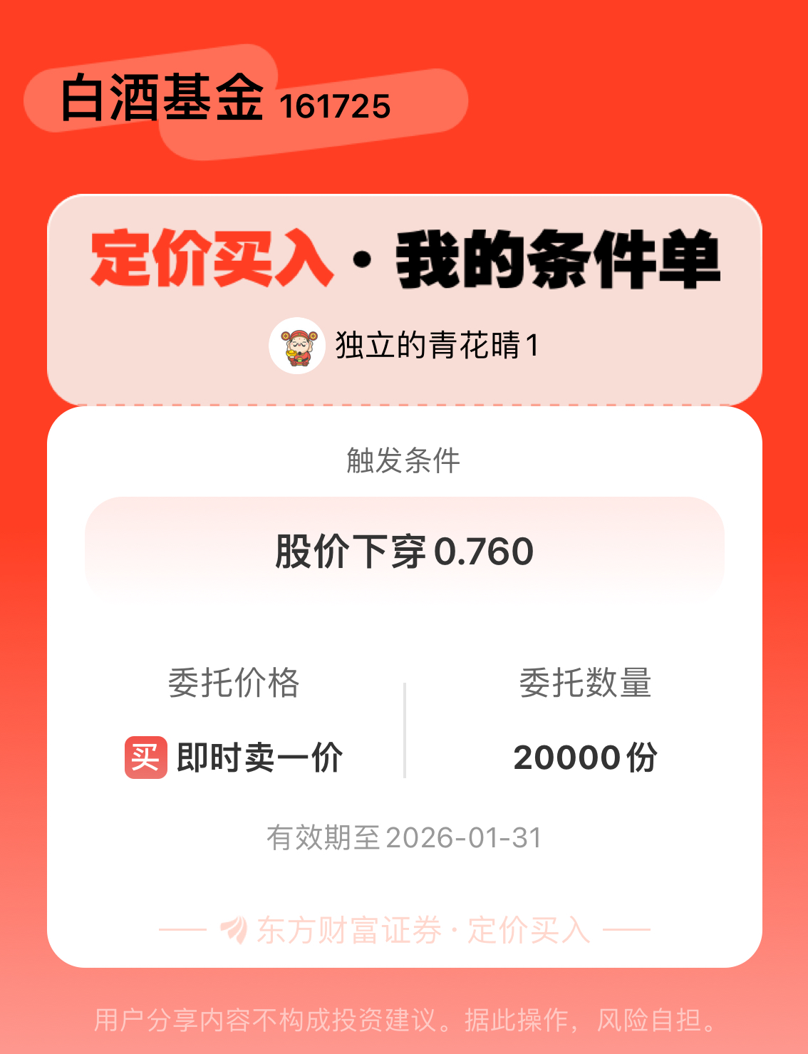 #条件单交流# #定价买入晒单# 一位股神设置了一个定价买入条件单,接下来就是见证奇迹的时刻~$白酒基金(SZ161725)$