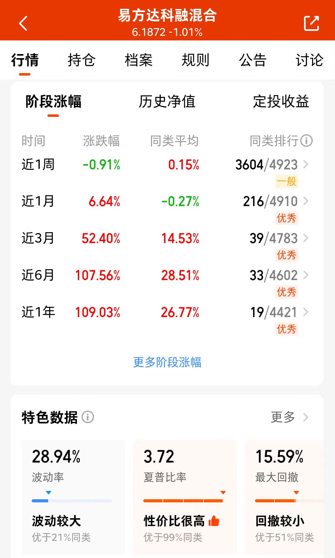 昨天沪指再次涨超4000点,今天股市行情继续反弹上涨,但是单一赛道可能风险会有点高,易方达科融混合不仅买了科技,还买了反内卷相关的新能源相关的;在反内卷政策持续发酵下,新能源行业也迎来了上涨,所以这只基金也不错呢。是成长赛道里的均衡之选。
