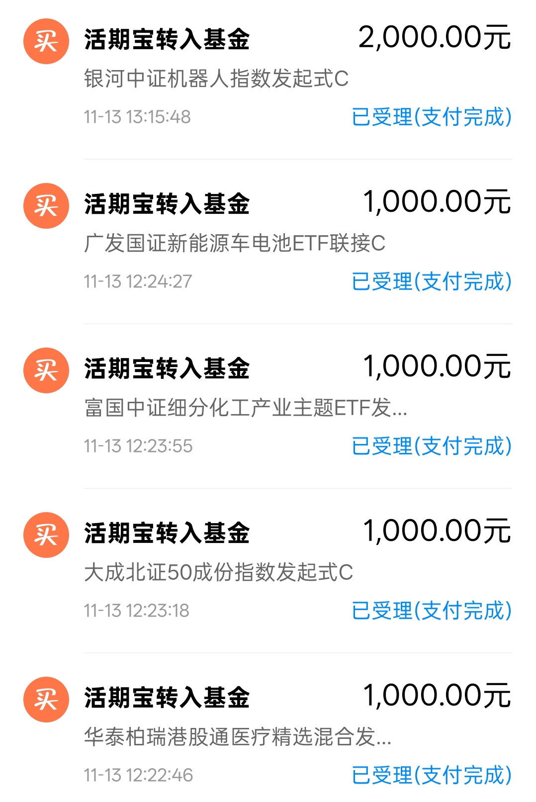 今天加仓电池、化工、北证50、机器人、港股创新药、恒生医疗、中证数据、中证软件,无卖出操作,所有中线标的继续持有待涨。