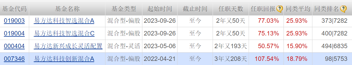 易方达基金经理蔡荣成长期从事科技赛道投资,积累了丰富实战经验。代表作$易方达科技创新混合A(OTCFUND|007346)$ ,2022.4月熊市途中任职,哪怕是经历了漫漫熊途,依然为投资者带来了105.92%的回报,同类平均收益只有18.79%,超额收益高达87%,市场排名前2%,是不是很优秀?