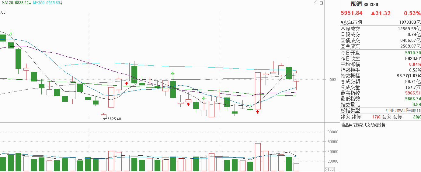 白酒:失守120天线,反弹无力?是见高回落再上演还是触底信号?