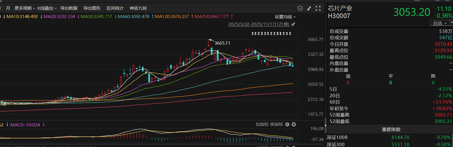技术面上,今天收小阴线,略微跌破60日均线,距离10月9日的前高回调已经接近20%,回调的时间和空间已经逐渐到位,代表短期的10日均线即将和代表中期的60日均线即将交汇,目前看还是更倾向于良性回踩,回踩后可能延续前面的趋势。