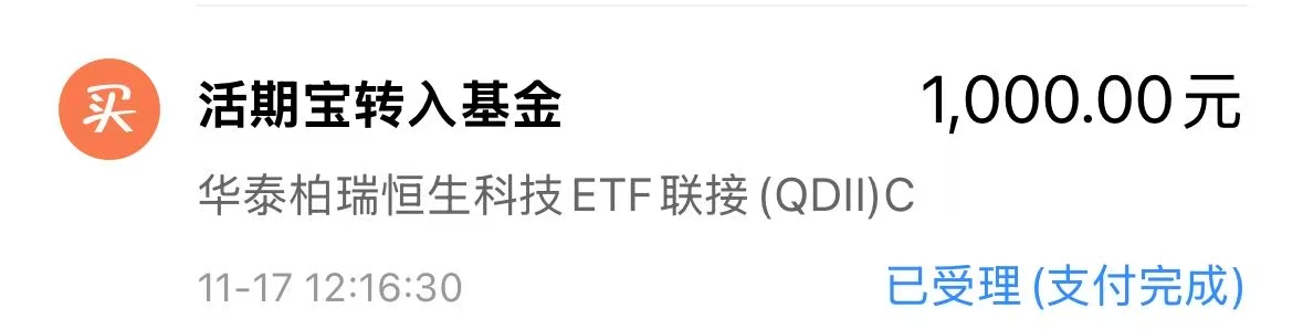 今天我继续加仓$华泰柏瑞恒生科技ETF联接(QDII)C(OTCFUND|015311)$ 1000元