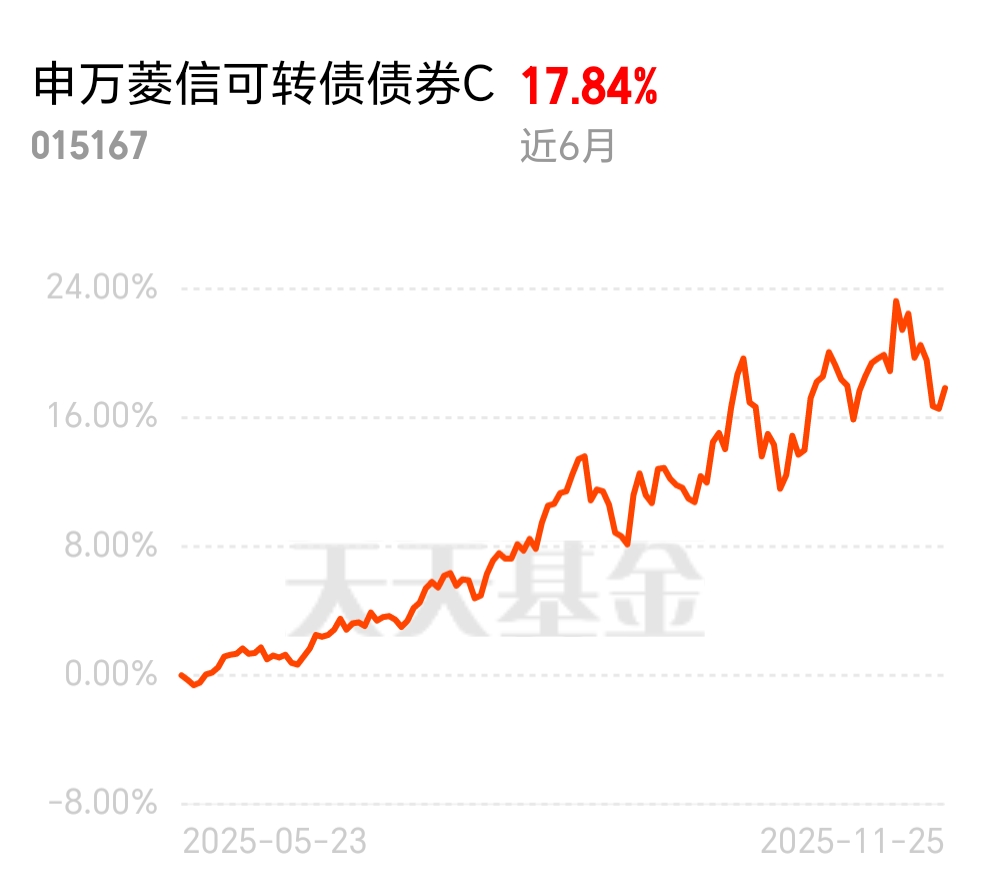 近期市场震荡不停,想赚钱又怕亏的朋友别愁,申万菱信可转债C值得看看。固收打底保稳妥,权益部分抓着有色、电子这些热门板块,近6个月17.84%的业绩很亮眼,既能控制风险,又能跟着市场赚收益。