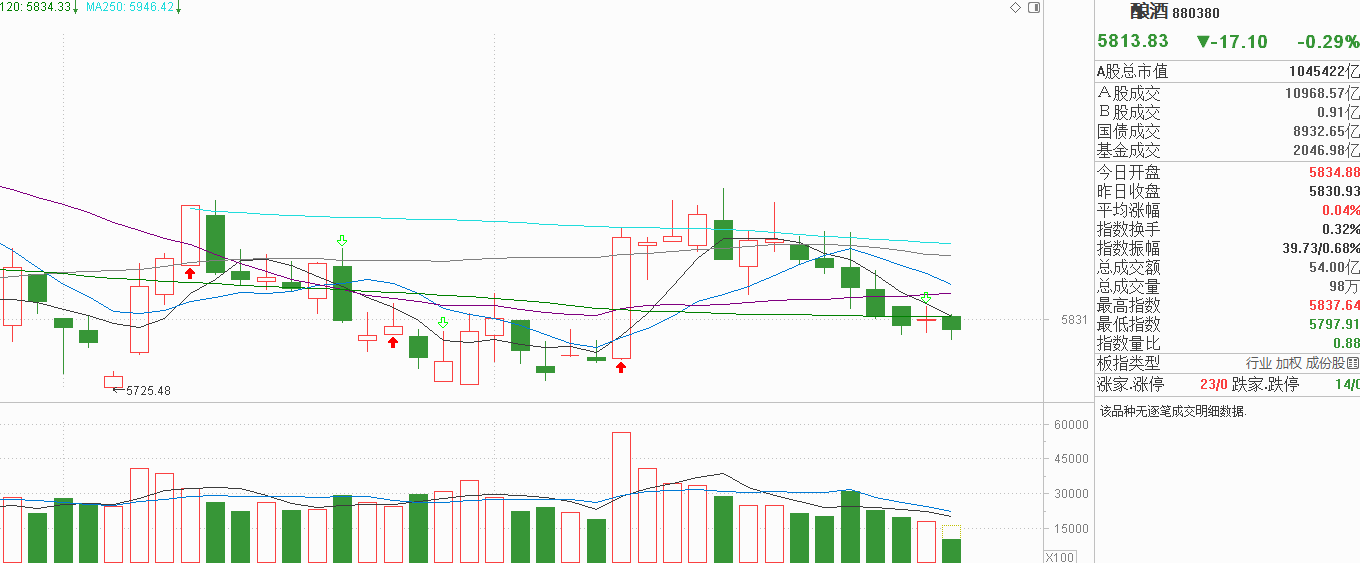 白酒昨天高开后继续冲高,但到了5天线又遇阻回落,回落时并没有再创新低尾盘回升收了个十字星,由于连续阴跌5天了,再出阴线就是6连阴,反倒能积累超跌反弹的动力,结果只是以十字星表现,考虑到前期大阳线就是存量资金所为,这种从那里来回那里去只能看成是震荡行情,如果没有技术超卖,要靠自身资金反弹我认为是很难的。今天白酒又是高开,可惜5天线继续下压,重新导致白酒走低再穿年线,由于昨天并不是回调的,今天调整只能算是第一天回调,并没有超卖信号,按原有趋势继续走低的概率很高。说白了白酒真要转势,第一根中阳线必须出现,然后等待新增资金流入,如果新增资金不流入,第二根中阳线更有必要。只要白酒场内资金无法积极两根中阳线的持续反弹,一律认为只是存量博弈,那怕做个高抛低吸,区间也不够大,和证券一样成为全市场性价比很弱的题材方向,我的节奏更差,这么窄幅的区间内波动收益也不大,我是没有这种能力把握这样的波动,还是观望好了。