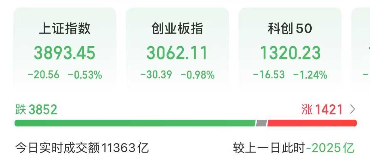 盘面上,截至我发文,上证指数下跌0.53%,创业板指数下跌0.98%,科创50下跌1.24%