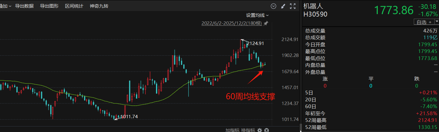 技术面上,机器人板块已显现出企稳迹象,目前指数正尝试收复120日均线,下方有250日均线支撑,进一步向下空间比较有限。