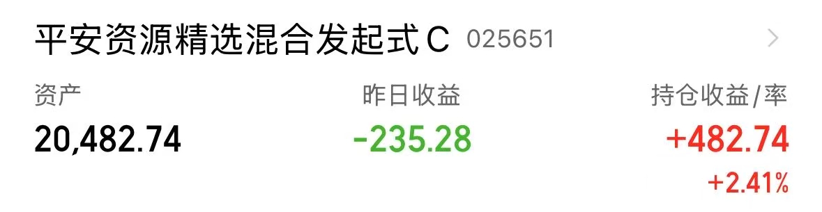 我之前加仓的$平安资源精选混合发起式C(OTCFUND|025651)$今天估值竟然是市场第一,很让我惊喜