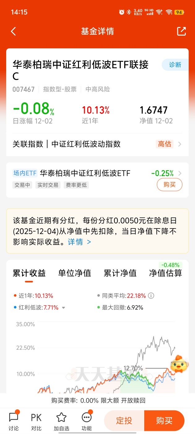 年末行情太磨人了,涨一天跌一天,手里的基金上蹿下跳,真心扛不住!但你有没有发现,红利低波这股风越刮越猛,成为了震荡市的“避风港”。毕竟每年年底到年初这段时间,红利策略本来就容易出彩,这日历效应可不是白说的。更关键的是,现在红利低波指数估值还在历史低位,安全边际拉满,相当于用便宜价买好资产。我一直关注的华泰柏瑞相关产品就很适配这个行情,它聚焦高分红、低波动的标的,行业分布也均衡,不会重仓押注某一个领域,能稳稳接住红利行情的红利,对于想求稳的投资者来说,确实是年末配置的好选择。#机构:看好“春季行情”提前开启# $华泰柏瑞中证红利低波ETF联接C$