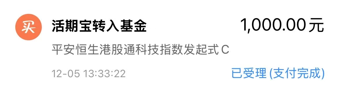 今天我继续加仓 $平安恒生港股通科技指数发起式C(OTCFUND|025526)$ 1000元