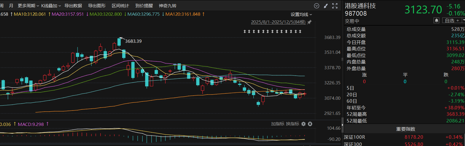 港股通科技已经调整两个月,近期波动开始降低,怎么也该轮到反弹了吧?从技术面上,港股通科技已经回踩了年线,年线是生命线,向上趋势中,这条均线一般不会跌破,所以这个位置我真不担心,我只会加大布局。