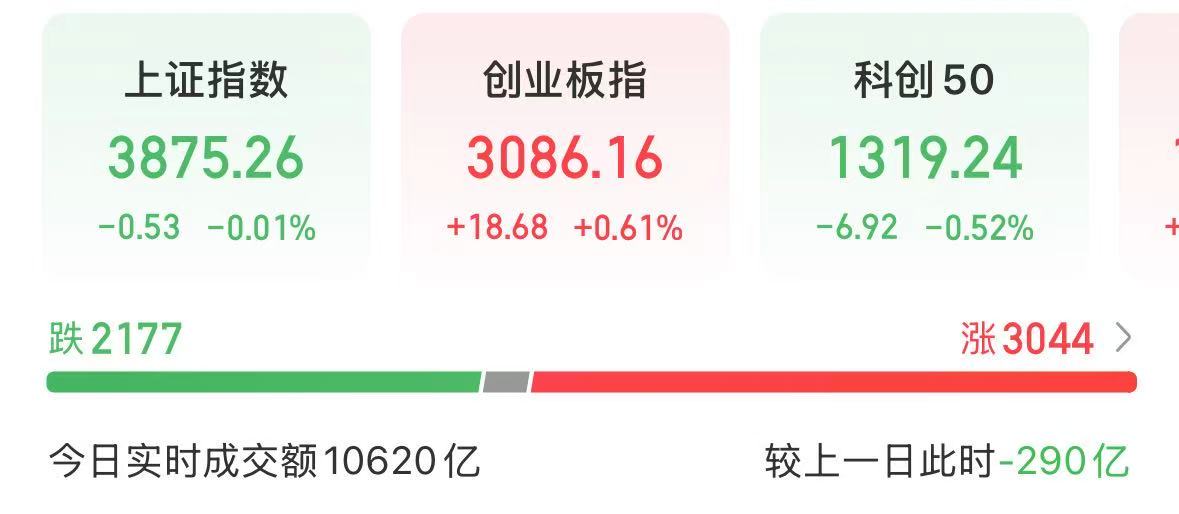 盘面上,截至我发文,上证指数下跌0.01%,创业板指数上涨0.61%,科创50下跌0.52%