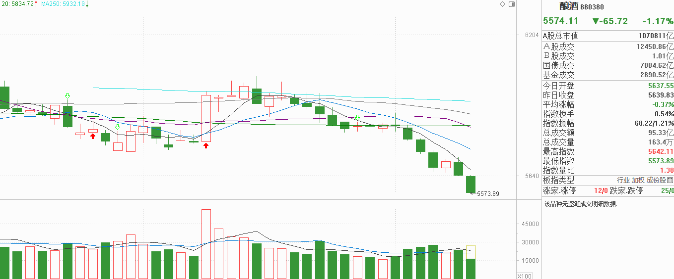 各位盯着白酒的朋友,昨天受5天线反压冲高回落小阴调整,阴线力度比较大,把上周五的小阳线彻底反包,今天继续向下走弱创调整新低我觉得不意外,很明显当前市场抛压谷底在较大,不少朋友还盯着11月10号的大阳线,认为主力只是在洗盘。不过我自此至终认为,这根大阳线很像医药去年自救性质的场内存量博弈,并不是新增资金的流入。存量资金积累了两个月才憋出了一次大阳线,没有任何的持续性,我以为白酒依然是在原震荡箱体内波动,结果现在击穿箱体还单边下行,比我的预期的还要弱,那就更不值得关注了。此前还认为连续两根中阳线就能扭转市场弱势,现在没有任何积极信号出现,反而回避了本次单边下行的风险,尊重市场真能回避下跌,是白酒现在唯一看到的亮点。