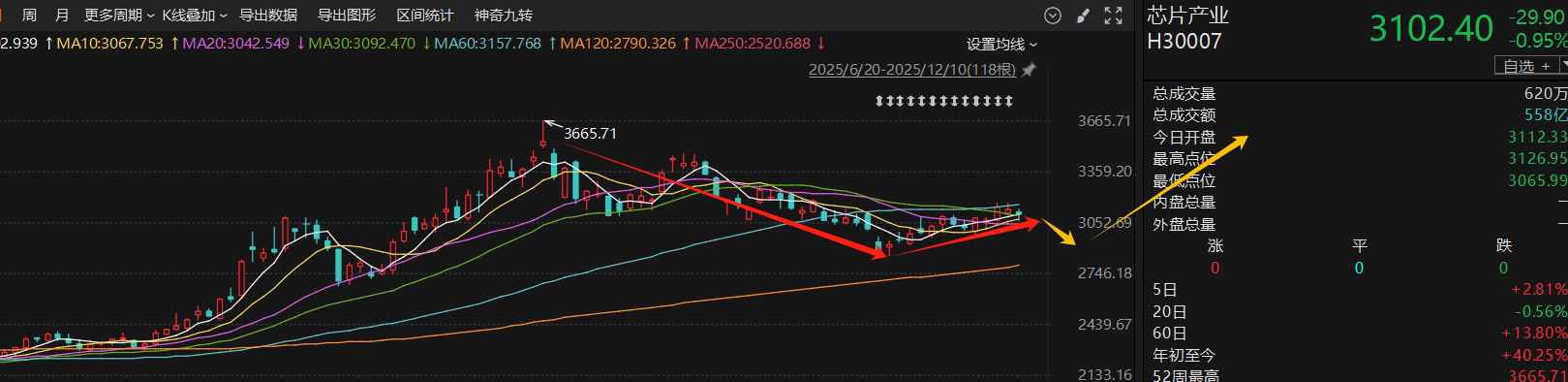 近期半导体板块回暖,我觉得基本已经企稳,长期均线向上,大方向我觉得问题不大,政策面上,今年科创板对硬科技企业的持续扶持,为行业发展提供了比较强的动力,并且今年AI算力芯片需求激增推动AI芯片、材料、封测、半导体设备等子领域景气度上行。同时,今年存储芯片涨价延续,我觉得半导体已经出现景气度可能延续到2026年。