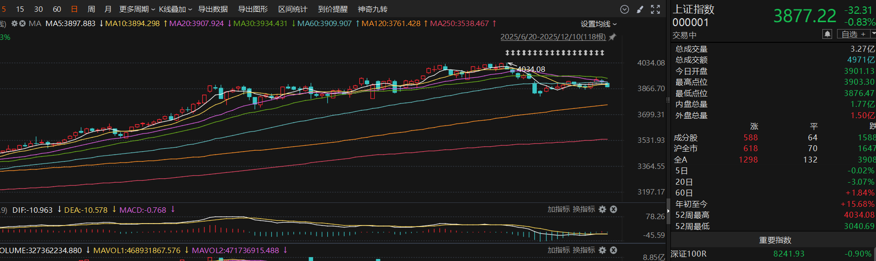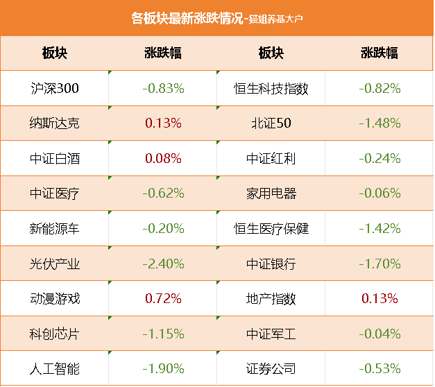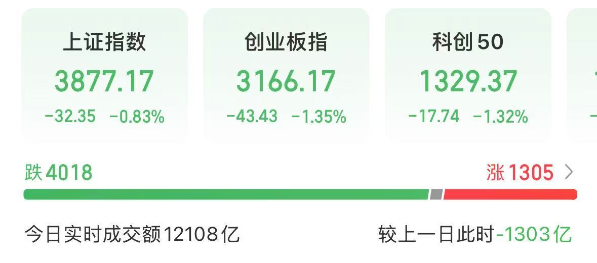 盘面上,截至我发文,上证指数下跌0.83%,创业板指数下跌1.35%,科创50下1.32%