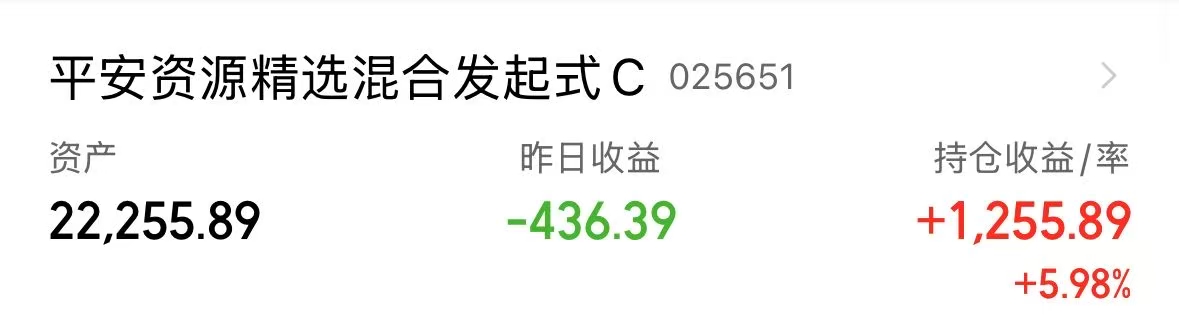 今天我不动,有色回暖,近期比较强势,美联储降息背景下,我长期看好有色,后面遇到回踩再考虑加大$平安资源精选混合发起式C(OTCFUND|025651)$