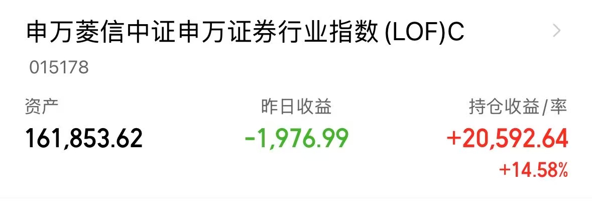 证券今天企稳回升,今天我躺平吃肉,昨天说等风来,今天这不就来了?今天企稳有可能代表开启下一轮成长空间,明年大盘想回到4000,我觉得还需要证券发力助攻,所以我还是坚持布局$申万菱信中证申万证券行业指数(LOF)C(OTCFUND|015178)$