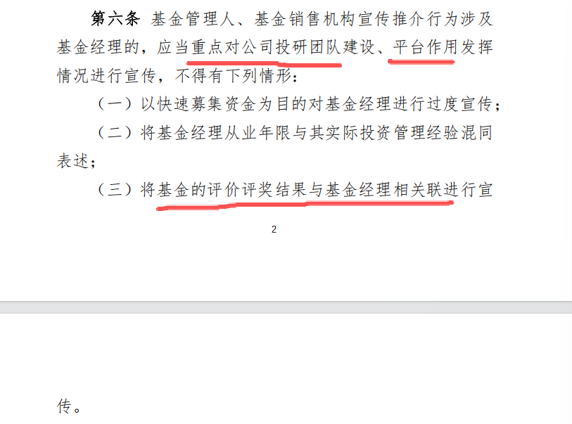 第六条的前两款好说,大家做的比较规范,比如介绍基金经理会看到:同时“有10年从业经验和5年产品投资管理经历”之类的说法,这就符合第二个规定。但是第三个就有点意思了:基金经理管理业绩好,拿了奖,不能和基金经理强挂钩宣传。