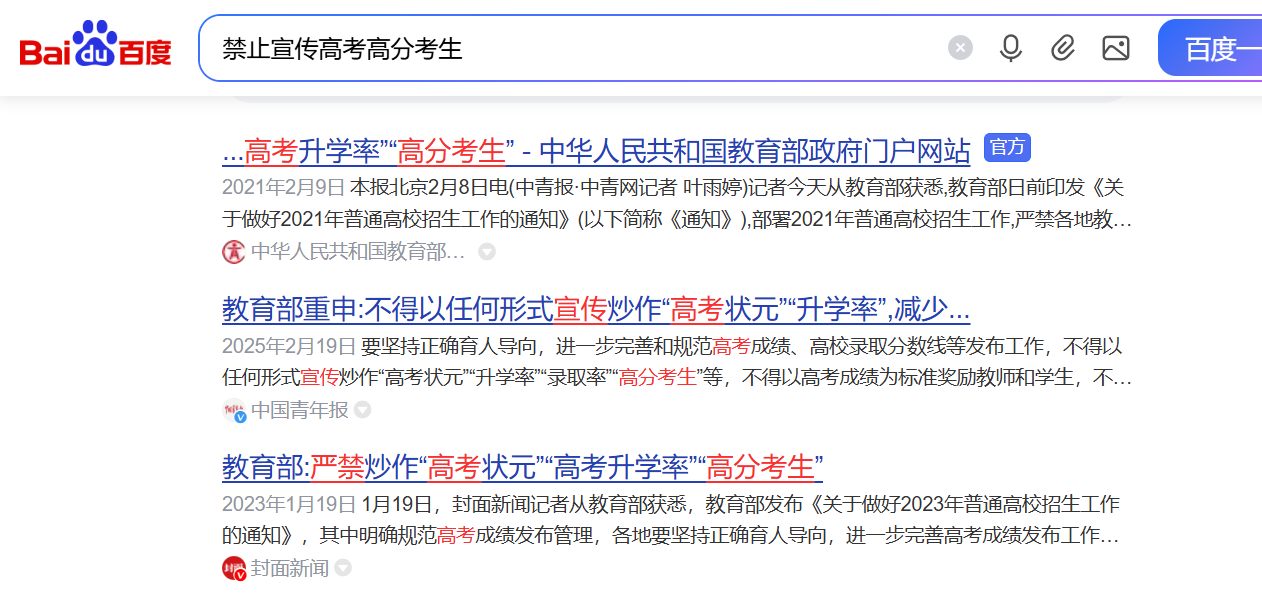 我国还有规定禁止炒作高分高考考生,但是大家在六七月,时不时看到在部分短视频平台某某学生高考成绩被屏蔽的新闻或是视频,还不少。