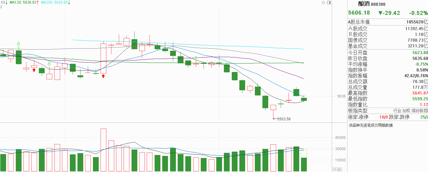 白酒这个怎么说呢?昨天大幅高开后一度冲高,可是维持的时间太短,最终冲高回落连10天线都守不住,说明上方抛压是比较大,而且白酒本来就是连续急跌后的技术修复,超跌反弹的趋势太过明显,再加上12月12号白酒虽然是上涨的,但却是高开冲高回落收星线,完全没有实体阴线,昨天虽然是高开后走低收的假阴线,实际上还是阳线,而且也没有实体。连续两天阳线力度与真正的中阳反弹完全不同,当然不会走出拐点。今天白酒低开冲高10天线后又回落至5天线,我觉得是正常的表现,这本就是一次下跌阶段的超跌反抽,并不是资金真正流入的表现,我觉得5天线也不一定会出现支撑,白酒依然有继续走低的可能。说白了要止跌必须得到市场新增资金的认可,光凭几个利好消息令场内存量博弈资金扭转弱势,又没有11月10号更大的做多动力表现,更像是明确的这么诱多信号,我不会上当。
