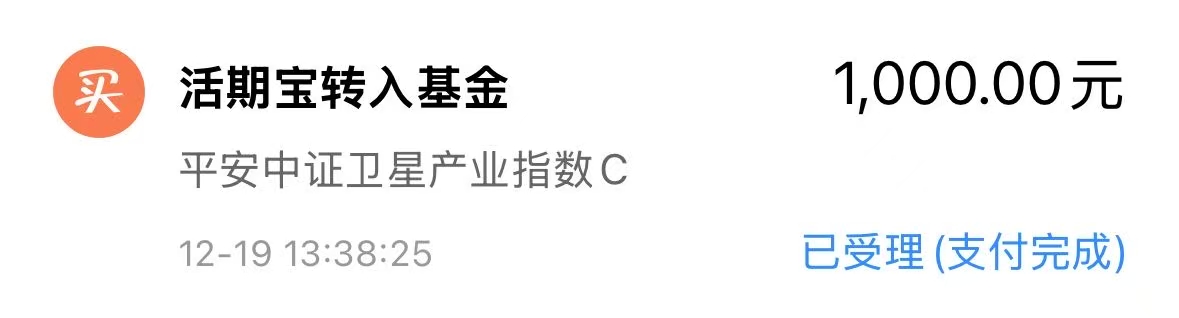 我今天继续追加$平安中证卫星产业指数C(OTCFUND|025491)$ 1000元