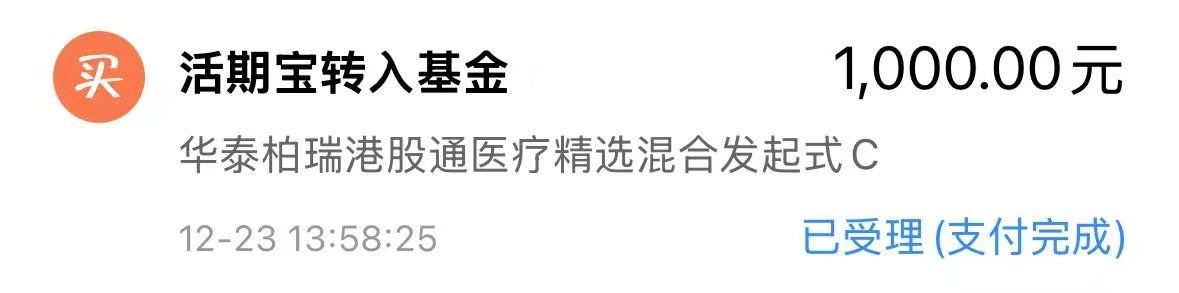 今天我继续重点加仓$华泰柏瑞港股通医疗精选混合发起式C(OTCFUND|019127)$1000元