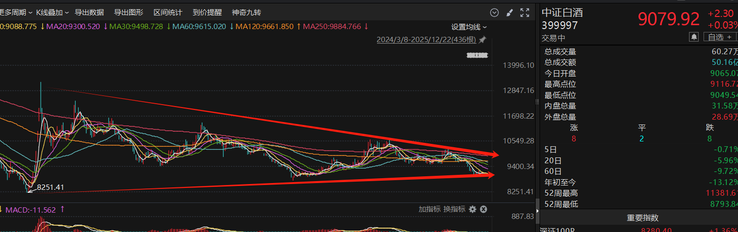 白酒今天小跌走势,基本面的反转可能还需要时间,但是技术面上已经收敛在一个窄幅区间内,我觉得可能要选择方向,前两低位附近连线来看是起到一些支撑作用的