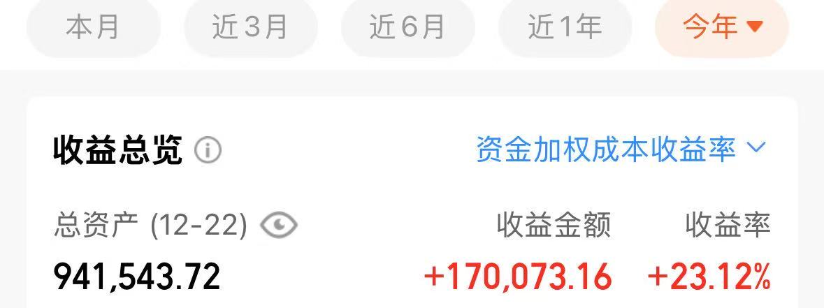 今年收益还凑合,赚了17个W,收益率23%,比指数好一些,我一直觉得定一个合理的目标比较重要,我的目标不是每年赚百分之几十那种不切时机的目标,我得目标就是牛市的时候比指数好一点,熊市的时候比指数亏得少一点,就满足了