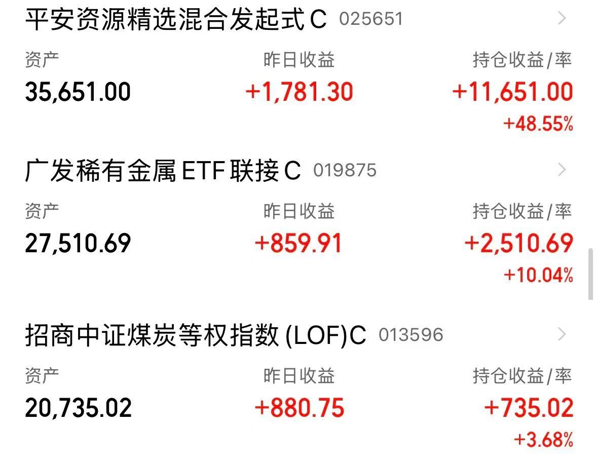 今天有色、煤炭、石油都是走V,近期主要加了煤炭,这个方向我觉得相对还没有动,我觉得目前资源有色还在前半程,如果回踩我再加大配置$平安资源精选混合发起式C(OTCFUND|025651)$
