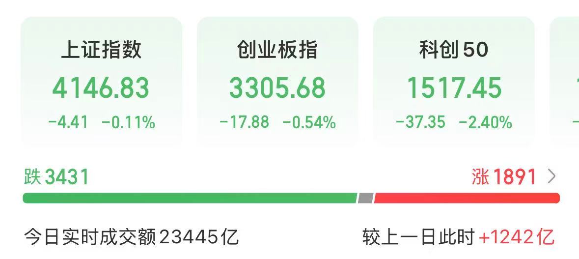 盘面上,截至我发文,上证指数下跌0.11%,创业板指数下跌0.54%,科创50下跌2.40%
