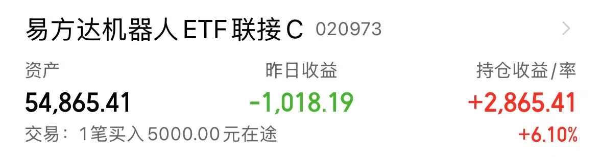 今日继续重点加仓$易方达机器人ETF联接C(OTCFUND|020973)$ 5000元