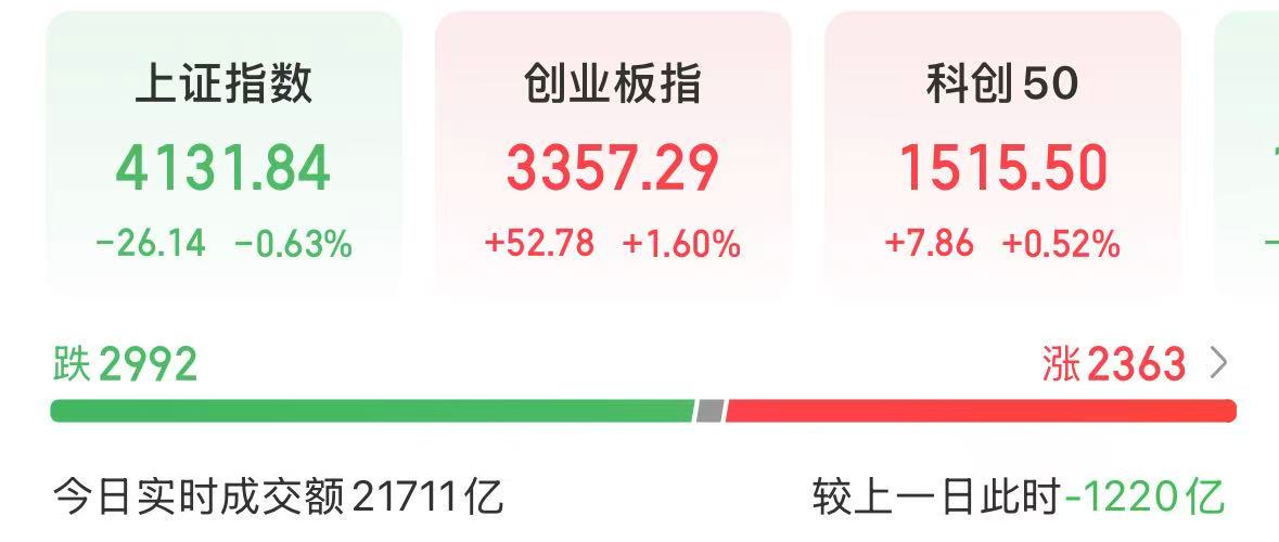 盘面上,截至我发文,上证指数下跌0.63%,创业板指数上涨1.60%,科创50上涨0.52%