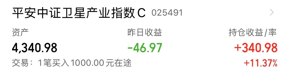 今日继续重点加仓$平安中证卫星产业指数C(OTCFUND|025491)$ 1000元