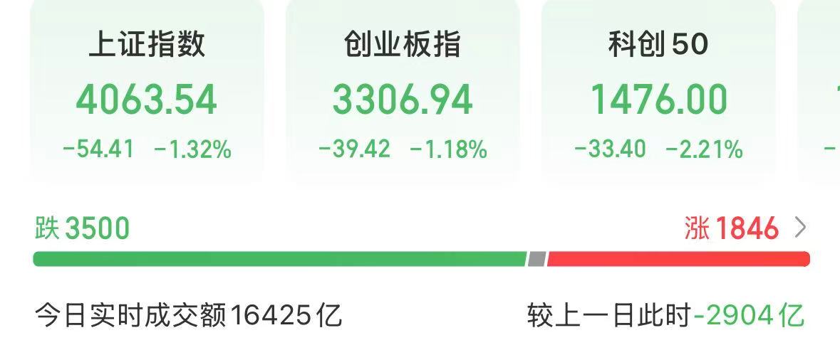 盘面上,截至我发文,上证指数下跌1.32%,创业板指数下跌1.18%,科创50下跌2.21%