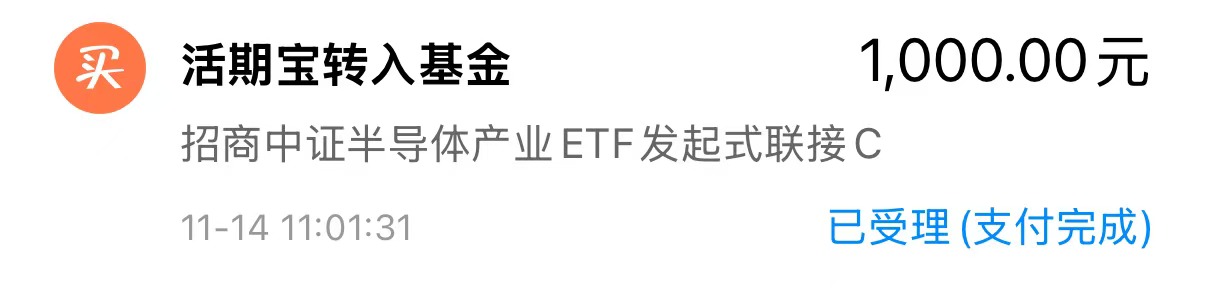 加仓1000元$招商中证半导体产业ETF发起式联接C(OTCFUND|020465)$,半导体上车机会来了,低位的时候不加仓等涨起来就不要再问能不能追了!今天开盘半导体集体低开,指数回踩60日均线后一路拉升,放量明显大幅增加,资金集体抢筹信号明显,经过近期的震荡洗盘后,赛道拥挤程度大幅降低,散户已经跑的差不多了,筹码交接后更有利于后续拉升行情,再往下就是抄底的机会了,性价比这么高的筹码不补仓小羊真的要拍大腿了!逻辑面上看,今年全球芯片涨价刺激相关产业需求,半导体行业即将进入新一轮产能扩张周期,产业面临全面的周期复苏,有着良好的发展机遇,另外,今年“十五五“规划强化科技优先地位,叠加之前的“Al+"行动意见、科创"1+6"等产业及资本市场政策,半导体行业支持力度全面且有力,行业发展前景良好,上涨空间依旧巨大,该基金$半导体材料、设备和应用硬科技领域,例如中微公司、中芯国际、寒武纪等半导体核心龙头企业,整体偏大盘风格,覆盖面广,近6个月涨幅48.36%,近3个月涨幅38.03%,同类排名均靠前,具有长期配置价值,近期回调幅度较大,正适合补仓,小羊从10月初已开始慢慢布局,当前收益0.42%,这才只是刚刚开始,当下美国对华半导体技术管制持续升级,也加速了国产替代化进程,国产替代已是必然,当下正是补仓的好机会,今日小羊继续上车。$