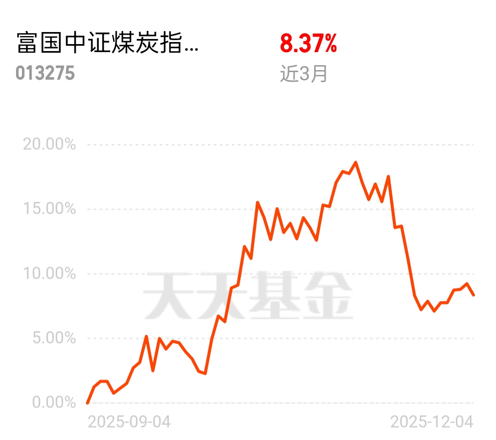 近期生物药板块有点静,就把一部分仓位挪到富国中证煤炭C,它近3个月涨了8%,跑得稳多数同类;持仓是陕西煤业、中国神华这些央企煤炭龙头,顺周期属性强,0.44%的年化跟踪误差贴得特别紧,老将管理11年,回撤后134天就收复失地,拿点底仓挺安心。