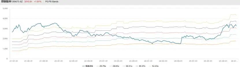 截止2025年12月16日,创50收盘3256.98点,5年前为2643.43点,累计上涨23%。PE自5年前的69.28倍至目前的39.64倍,市场经历了高估、下探、理性回归的历程。