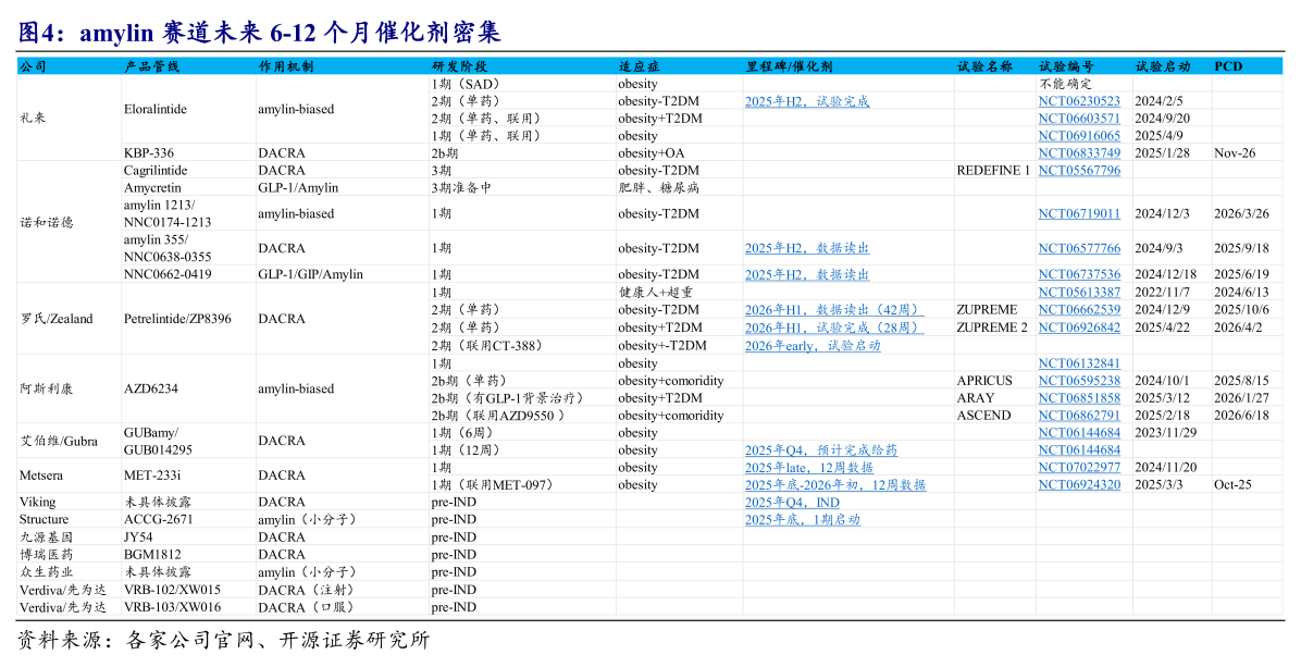 值得注意的是,已有不少MNC重金押注Amylin类药物,原因在于既能有效抑制食欲,又能避免GLP-1疗法常见的肌肉流失副作用,而且未来一年内将迎来密集催化剂。