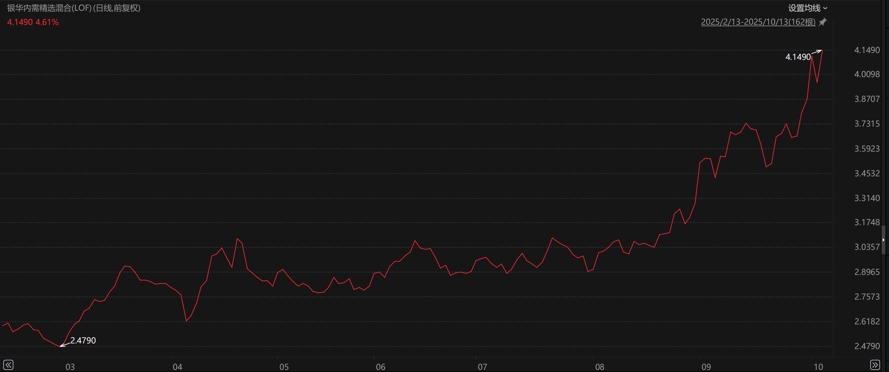 2025年10月14日,A股市场有色金属板块表现活跃,国际金价持续走强站上3650美元/盎司上方,年内累计大涨超1000美元/盎司。在这一背景下,以贵金属为主要投资方向的基金产品业绩表现尤为亮眼。近期市场行情显示,全球制造业产业链重构和固定资产投资提升,对大宗商品价格形成有力支撑,特别是金银等贵金属板块涨幅显著。今日$银华内需精选混合(LOF)$(161810)单位净值已达4.1490元,近一周涨幅7.15%,超越99.64%的同类产品,展现出强劲的上涨势头。