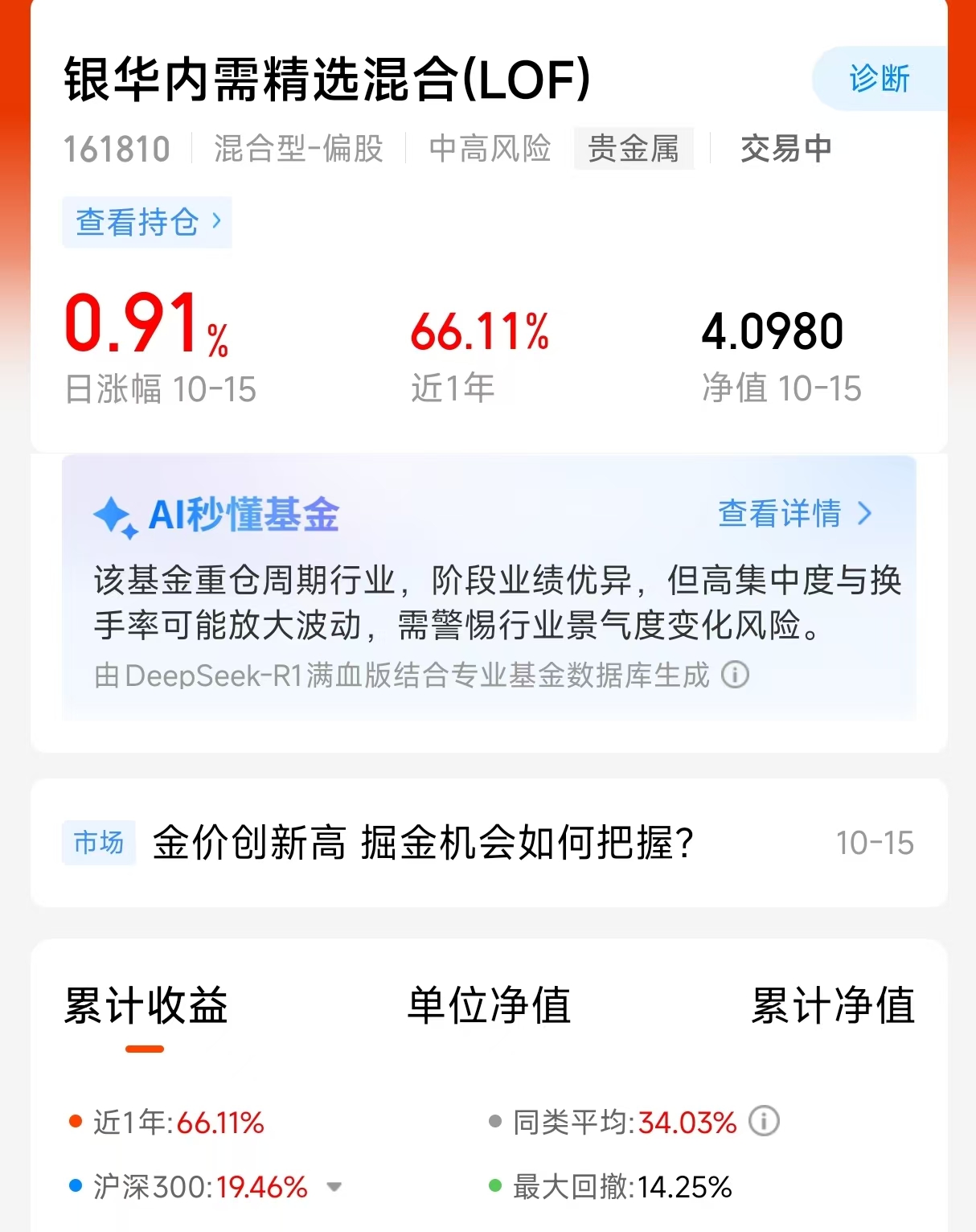 黄金这几天疯了,突破4200美元/盎司之后根本停不下来,昨天居然冲到了4220美元!好多人在问现在还能不能追黄金股,要我说,不如看看$银华内需精选混合(LOF)$(161810)——这基最近三个月涨了38%,今年以来涨了69%,比直接买黄金股更稳当!为啥?因为金价涨了,但黄金公司的利润传导还需要时间,等财报出来可能还有一波空间。这基前十大重仓全是黄金产业链的实力企业,从挖矿到冶炼都覆盖了,金价涨一毛,这些公司赚的可能不止一毛!而且基金经理王利刚管了4年多,经验丰富,换手率才51%,明显是长期看好黄金赛道。#存储芯片掀涨价潮!行业或迎超级周期#