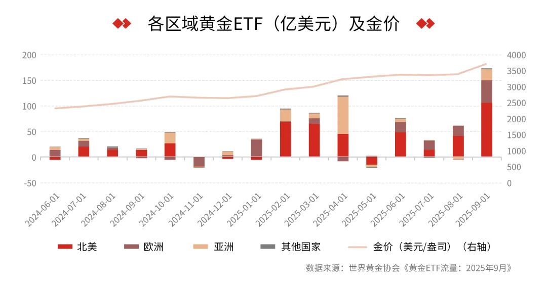 黄金ETF资金的持续注入也对金价形成了支撑。9月黄金ETF的流入量大幅增长,主要以北美和欧洲的资金贡献为主,亚洲资金在四月份表现较突出,其余时间则较为平淡。截至第三季度末,全球黄金ETF管理总资产(AUM)达到4720亿美元(环比+23%),再创历史新高。(资料来源:世界黄金协会)