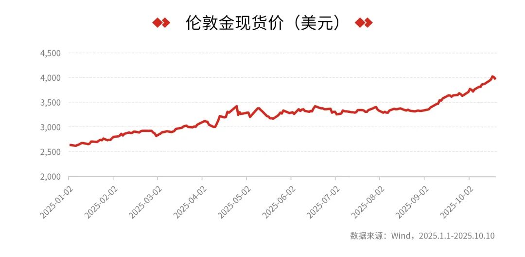 2025年10月8日,伦敦现货黄金价格触及4040.05美元/盎司的历史峰值,这一突破距离3月首次站上3000美元仅隔7个月,年内涨幅已超50%(2025.1.1-2025.10.10),创下1980年以来(1980.1.1-2025.10.10)最快年度涨速。(数据来源:Wind)宏观政策的“东风”、地缘局势的“小插曲”等多种因素一合起来,把黄金这避险选手抬上了从没到过的“山顶”!