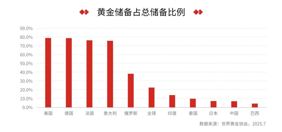 截至2025年7月,全球央行的黄金储备占总储备比例为22.4%,中国黄金储备的占比为7%,低于全球水平,与美国、德国等国家央行黄金储备相比,仍有较大的发展空间。(资料来源:世界黄金协会)