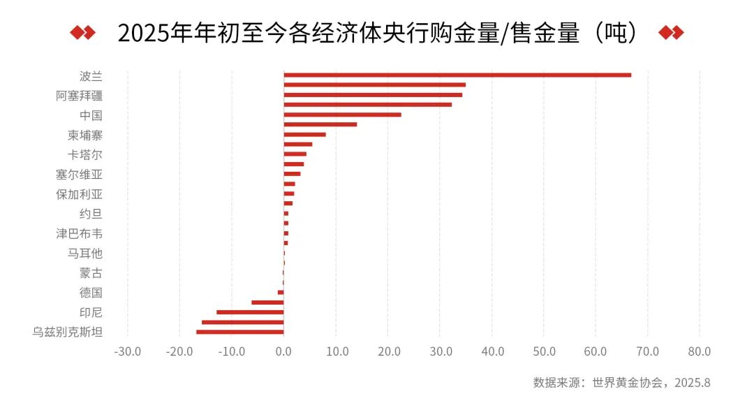 今年年初至8月,波兰、阿塞拜疆、中国等国家央行的购金量名列前茅。