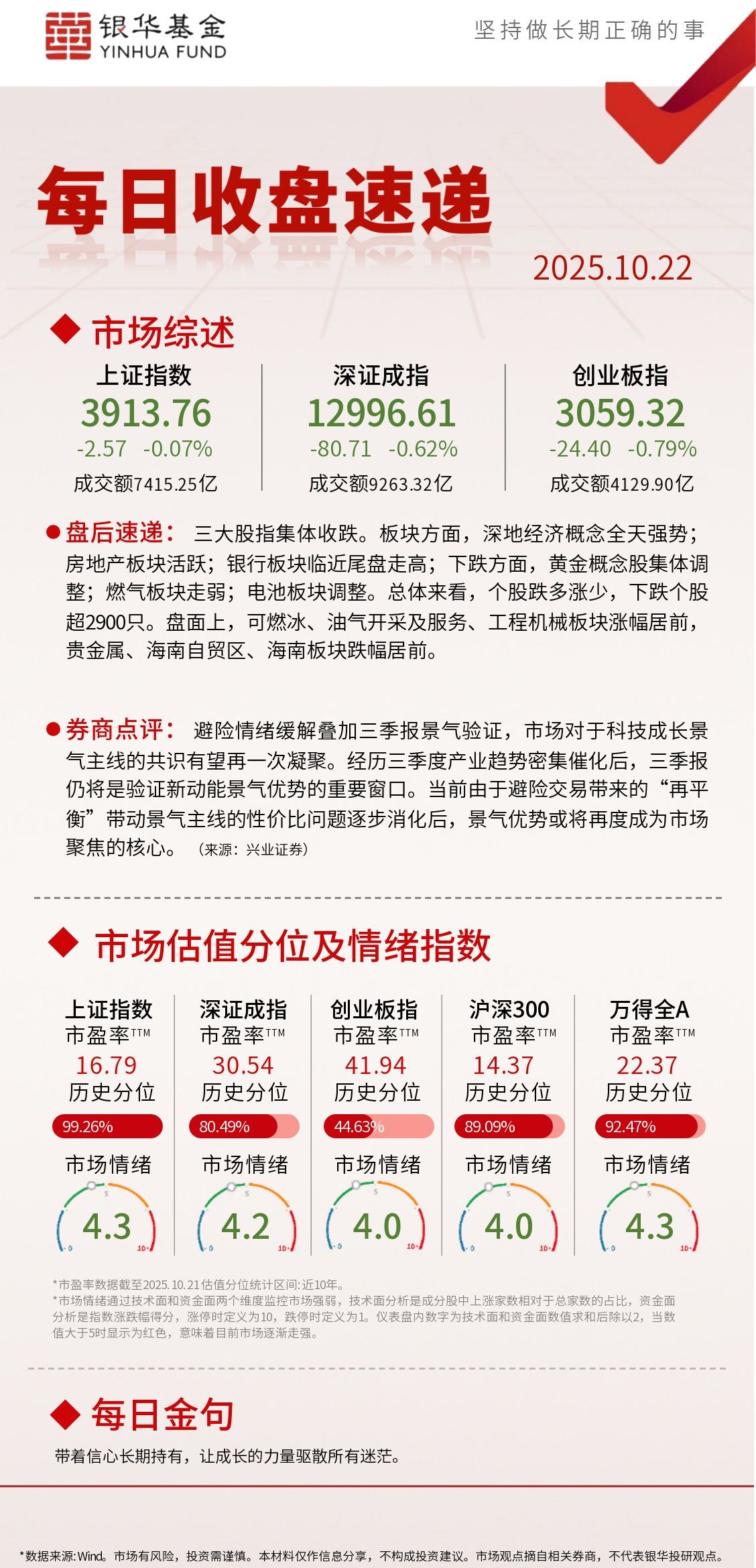 每日收盘速递 | 2025.10.22 三大股指集体收跌,黄金概念股集体调整