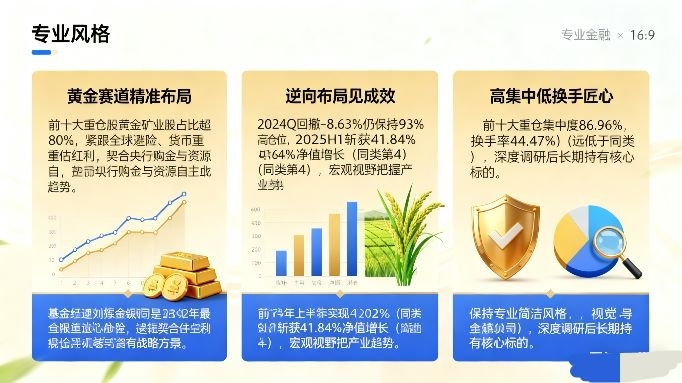 1. 黄金赛道的“先知先觉”基金前十大重仓股中黄金矿业股占比超80%,精准捕捉2025年全球避险情绪升温与货币属性重估的红利。基金经理刘辉在季报中明确:“金银资产是2024-2025年最具确定性的主线之一”。这种聚焦不追逐热点,而是基于对宏观经济周期的深刻理解——当全球央行持续购金,内需消费与资源自主成为战略方向,基金的重仓逻辑与时代脉搏同频共振。