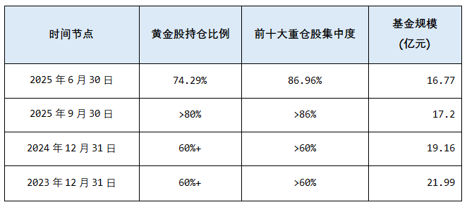 其次,黄金股持仓稳定。从2025年一季度到三季度,基金的黄金股持仓比例从约70%逐步提升至74.29%,且核心持仓标的如山东黄金、中金黄金、赤峰黄金等始终保持在前十大重仓股之列,显示出基金经理对黄金赛道的坚定看好和长期持有策略。