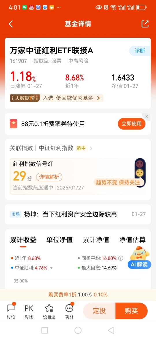 2024年以来,在大盘持续震荡调整的情况下,红利类基金表现亮眼。万家中证红利指数基金聚焦于具有稳定分红和高股息的优质企业。精心筛选了那些在经济周期中表现出较强韧性的公司,为投资者提供了一份相对稳健的投资选择。