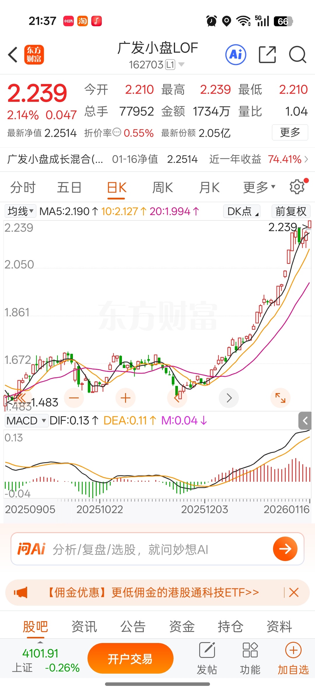 我的帐户市值之所以能不断创新高,原因是能准确买在启动点,而且重仓的基金能不断发力,比如这个广发小盘买入五个多月,我毫不费力,甚至不需看盘,但浮盈已超60%,甚为开心